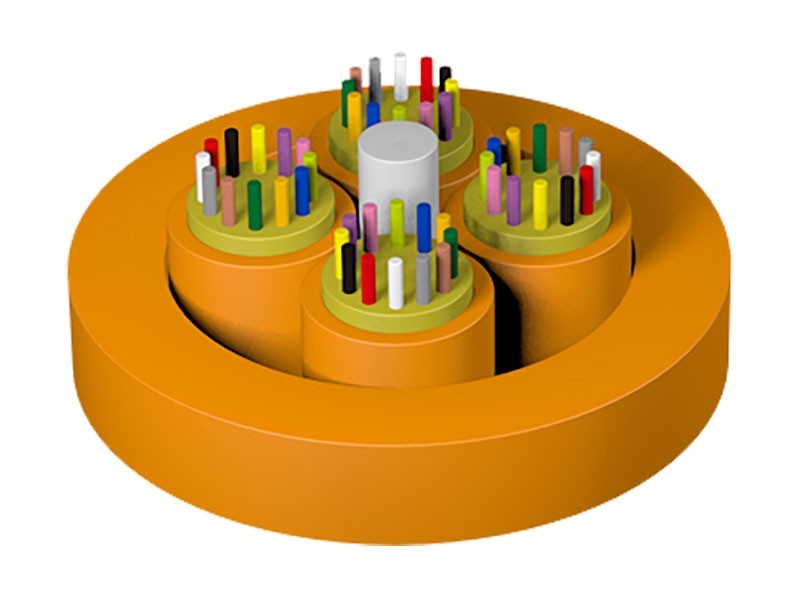 室内多芯分支光缆GJBFJV使用 12 芯子单元(Φ250µm 着色光纤、芳纶加强元件),非金属中心加强芯,光缆子单元层绞于中心加强芯形成缆芯,最外挤制一层聚氯乙烯(PVC)或低烟无 卤材料(LSZH,低烟、无卤、阻燃)护套而成。