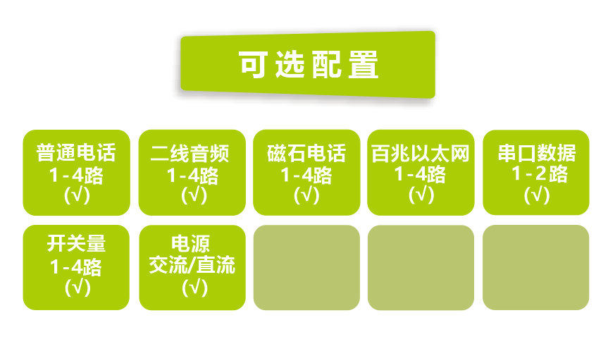 ◆ 语音口支持FXO/FXS/2线音频/磁石电话接口,FXO口与程控交换机对接,FXS口与用户的电话机相连;